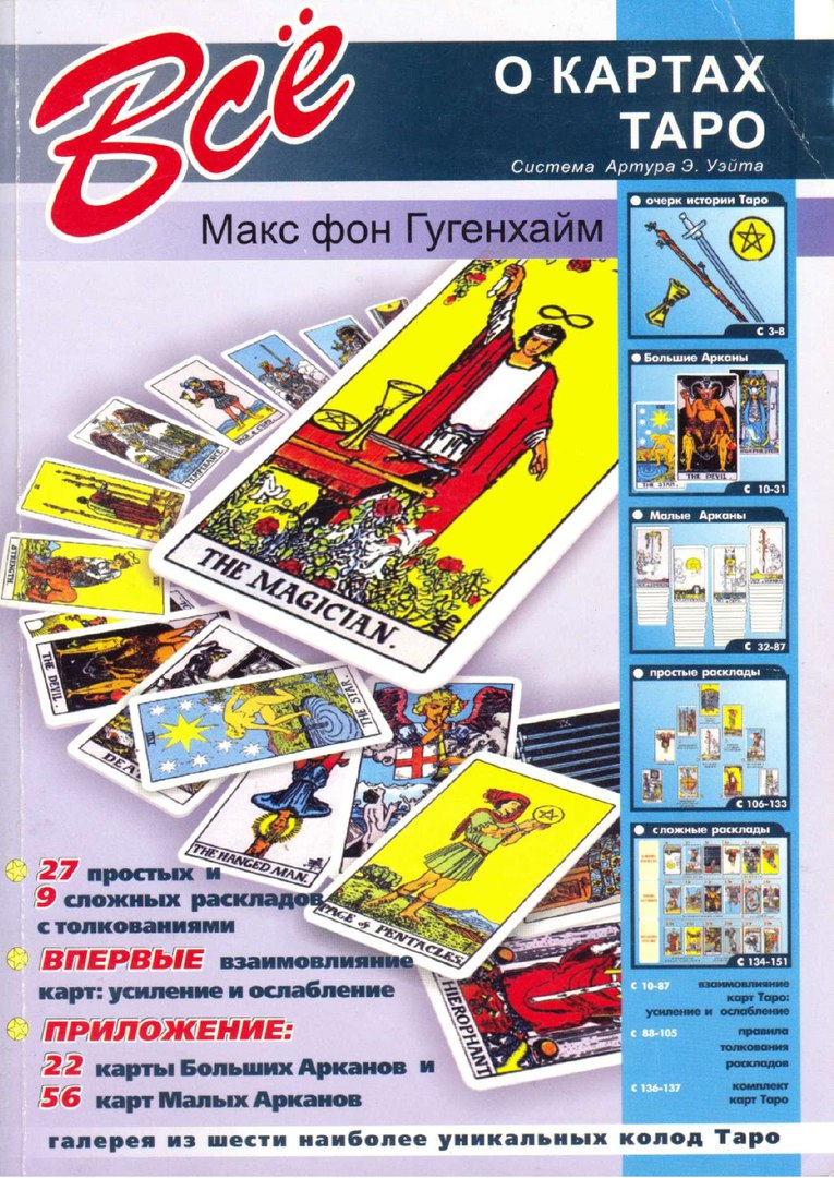 Книга Макса фон Гугенхайма, которую вы держите в руках, посвящена его изложению системы Таро Артура Э. Уэйта. Помимо краткого очерка об истории Таро, в книге приводится детальный анализ предсказательных значений всех 78 карт колоды, а также представлены 27 простых и 9 сложных раскладов с конкретными примерами толкований. В качестве особого раздела книги фигурирует описание взаимовлияния карт Таро (усиление и ослабление), что дополнительно обусловливает новаторский подход Макса фон Гугенхайма к вопросу. Современный красочный дизайн, непритязательная манера подачи материала автором, а также прилагающаяся полная колода из 78 карт, нарисованных соратницей А. Э. Уэйта - Памелой Коулман Смит, - все это может быть отнесено к безусловным достоинствам книги и призвано облегчись читателям знакомство и освоение системы Таро Артура Э. Уэйта.